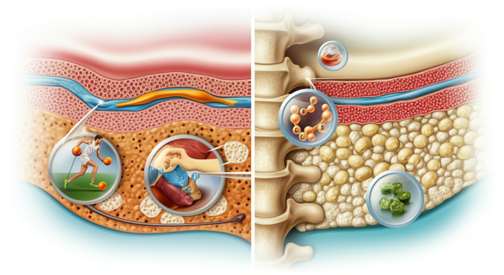 Além disso, a resistência óssea está diretamente associada à saúde muscular. Para ilustrar, músculos e ossos formam um sistema interdependente: o estímulo muscular promove deposição mineral e remodelação óssea, enquanto ossos saudáveis garantem suporte para a ação muscular.